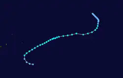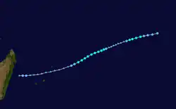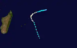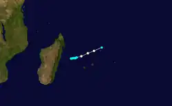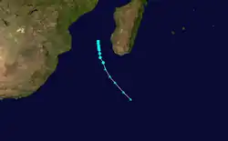 As early as December 18, an area of low pressure persisted near Diego Garcia. By December 24, falling pressures and increasing winds indicated that Tropical Storm Cecile had developed near St. Brandon.[6] At its peak, the storm reached tropical cyclone status, or peak winds of at least 120 km/h (75 mph).[7] On December 25, Cecile passed just east of St. Brandon,[8] where it produced winds of 93 km/h (58 mph) and a pressure of 992 mbar (29.3 inHg). The storm tracked southward, passing between Mauritius and Rodrigues while weakening. Cecile turned more to the south-southeast in tandem with a large anticyclone moving eastward.[6] The storm was last noted on December 28,[8] having become extratropical that day.[7]