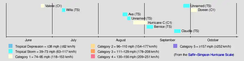 A tropical storm named Bernice developed on September 2 west of Jalisco. After moving northwestward for two days, the storm turned to the north, striking Baja California on September 6 before dissipating.[3] The remnants of the storm later brought moderate rain to Arizona.[8]