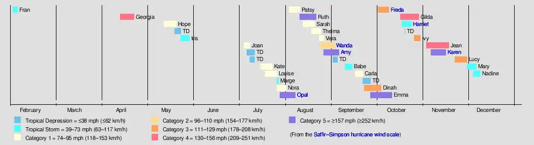 Two depressions, 50 and 63, formed in the Central Pacific under the Joint Hurricane Warning Center's (now The Central Pacific Hurricane Center) jurisdiction and were included in the JTWC archives. Both depressions stayed out to sea and had no effects on land. The Central Pacific also got Nora, Opal, Ruth, Gilda, Emma and Thelma, the remnants of Nadine and the ending of Karen near the end of the season.[2][3] Six typhoons entered the Bering Sea: Nora, Opal, Ruth, Thelma, Amy and Emma. Four of the six were super typhoons. Three typhoons just missed entering the Bering Sea: Typhoons Hope, Sarah and Gilda. Also, Typhoons Georgia, Hope, Joan, Nora, Opal, Ruth, Thelma, Wanda, Amy, Emma, Gilda, Jean and Karen all lasted for at least one week with Opal lasting for eighteen straight days from a wave to the day the JMA ceased advisories.[4]