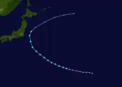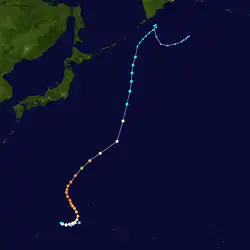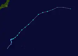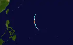 An easterly wave, the ninetieth (and final)[2] of the season, was first sighted on December 6 by the Joint Typhoon Warning Center several hundred miles southeast of Guam. The wave strengthened that day into Tropical Depression Ninety, appearing in the Japan Meteorological Agency's track data at that point. The depression curved to the northwest, striking the island Guam on December 7. Tropical Depression Ninety curved to the southeast of Saipan on December 8, strengthening into a tropical storm. Given the name Nadine by the Joint Typhoon Warning Center, it progressed northward, peaking at a minimal pressure of 974 millibars (28.76 inHg) and a wind speed of 60 mph (97 km/h) on December 10.[42][43] Nadine began to approach the International Date Line (180°), but started an extratropical transition that same day.[2][4]