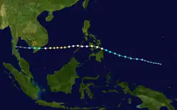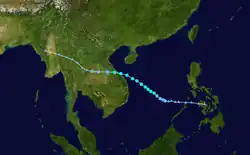 The eighty-ninth (and second-to-last) tropical wave of the season formed in the South China Sea, several hundred miles west of the Philippines. The wave was upgraded by the Joint Typhoon Warning Center as Tropical Storm Mary (instead of Tropical Depression Eighty-Nine) on December 1, following suit with the names used before.[2] The depression was never followed by the Japan Meteorological Agency, however, the system was tracked by the Warning Center its entire time in the South China Sea. Mary went towards the southwest, peaking at winds of 55 mph (89 km/h) on December 2.[41]
