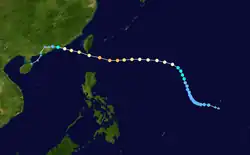 The typhoon continued to intensify, maintaining typhoon status during the day and reaching a peak sustained winds of 90 mph (140 km/h) on the morning of July 22. Central pressures were recorded at a minimum of 970 millibars at peak as well. (Operationally, the Joint Typhoon Warning Center had Kate peaking at sustained winds of 100 mph (160 km/h), making it a Category 2 cyclone on the Saffir-Simpson Hurricane Scale, however this was demoted in post-analysis.)[8] As Kate approached Taiwan, the storm weakened, making landfall on the afternoon of July 22 near Taitung City with sustained winds of 80 mph (130 km/h). The storm crossed the island over the afternoon, weakening into a tropical storm by the afternoon. After emerging from Taiwan, Tropical Storm Kate turned to the northwest and made landfall once again near Wenzhou on July 23 with sustained winds of 60 mph (97 km/h). The interaction with land cause quick dissipation of the storm over mainland China, and the warning center ceased following the storm on the morning of July 24.[2] The remains of Kate continued on for a short distance, crossing through China over the next day and into Mongolia before dissipating on July 25.[4]