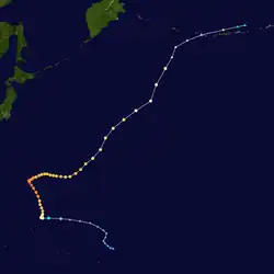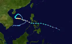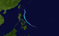 Another surge from the easterlies, combined with the forty-fourth tropical wave of the season, began to develop off the east coast of Luzon in the Philippines on the morning of July 18. At the time, the tropical wave had winds of 15 mph (24 km/h) on its surface. The wave rapidly intensified during the morning and the Joint Typhoon Warning Center upped the system to a tropical depression the same afternoon. The next morning the system was upgraded to a tropical storm and received the name Kate. The new storm had a small, open eyewall which expanded during the day as the storm slowly intensified through and by the late morning of July 20, the storm became a typhoon with winds of 75 mph (121 km/h).[8] That morning, the eye had only a 12-mile (19 km) diameter and had similar surface winds. During the afternoon, the storm made a curve to the southwest from its track and looped back northward. By the morning of July 21, the storm began a northeastern turn towards Taiwan.[2]