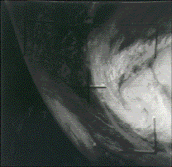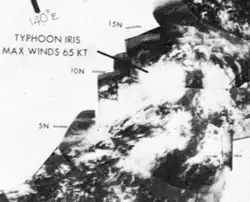 A tropical wave, the 22nd of the 1962 season, forming on May 26 met a polar trough northeast of the island of Koror. This fracture caused the wave to begin developing during the early morning hours. The system rapidly intensified and became the fourth tropical depression of the season on the same afternoon. Rapid intensification occurred and within six hours, the depression became Tropical Storm Iris on May 26 just east of the Philippines. The eye of Iris began to define itself, as operationally winds reached 75 mph (121 km/h) on May 27, which would classify the system a typhoon. However, in post-analysis, Iris was never able to strengthen into a typhoon, peaking at winds of 70 mph (110 km/h) off the Philippine coast.[7] A minimum central pressure was read of 990 millibars within the storm. Iris paralleled the shore for several hours, beginning a rapid weakening process, falling to a minimal tropical storm with winds of only 40 mph (64 km/h) by the end of the day.[2]