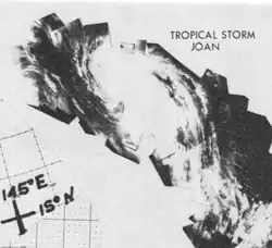 Another easterly wave formed off to the northeast of the Philippines on the afternoon of July 6 after reaching a polar trough. The system quickly organized itself, strengthening into a tropical storm on the morning of July 7. Named Joan, the storm curved to the northwest through the Pacific, rapidly intensfying into a typhoon by the next day. The storm reached a peak sustained windspeed of 90 mph (140 km/h) just to the southeast of the island of Okinawa. The minimum pressure for the storm was registered at 985 millibars (29.1 inHg). After passing Okinawa on July 9, the forward speed in Typhoon Joan increased and the storm began to weaken. The storm boasted an unorganized, elliptical eye as it soon fell to a minimal hurricane that afternoon. On the evening of July 9, the now-Tropical Storm Joan passed due east of Shanghai, China before turning to the northeast on the morning of July 10. With only sustained winds of 50 mph (80 km/h), the system struck the shore of South Korea on the afternoon of July 10. The storm continued weakening as it crossed the 38th parallel and entered North Korea, falling to a minimal tropical storm over land. After emerging from North Korea, the storm raced to the northeast before experiencing cold air and become extratropical on the morning of July 11.[2]