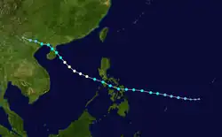 An easterly tropical wave after the polar trough fractured the superposition formed on November 3 near Yap. The wave made landfall in the Philippines on the 6th and strengthened into Tropical Depression Eighty-One over land. Strengthening occurred and the depression became Tropical Storm Jean on the 6th near Manila. Rapid strengthening occurred and Jean peaked at a 100 mph (160 km/h) typhoon on November 9 near Vietnam. Jean started weakening and dissipated on November 13 because of lack of upper level divergence.[2]