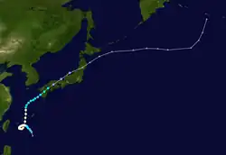 The extratropical remnants of Georgia continued northward east of the coast of Japan. On April 26, the extratropical remnants passed to the southeast of the Kamchatka Peninsula. During the day, the system curved once again, turning westward before another curve to the south. During the day on April 27, the system returned to its northeastern pattern before dissipating on April 29, southeast of the peninsula.[4]