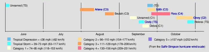 Tropical cyclogenesis began early, an unnamed tropical storm developing on June 1. However, activity ceased for nearly two months, before Arlene formed on July 31. Another system formed in August, Hurricane Beulah. September was much more active, with Cindy, Debra,[2] an unnumbered tropical depression.[7]: 270–271 Edith, and Flora all developing in that month. Flora was the most intense tropical cyclone of the season, peaking as a Category 4 hurricane with winds of 150 mph (240 km/h) and a minimum barometric pressure of 933 mbar (27.55 inHg). There were two other system in October, Hurricane Ginny and Tropical Storm Helena; the latter dissipated on October 30.[2]