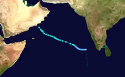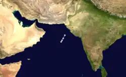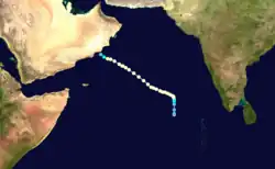 On May 19, a tropical disturbance formed over the Laccadive Islands, before tracking northwest towards the Arabian peninsula. The system achieved cyclone intensity on May 22. On May 24, a United States Weather Bureau reconnaissance aircraft flew into the 19 km (12 mi) eye of the storm, encountering winds of 193 km/h (120 mph).[4] A ship 111 kilometres (69 mi) west of the system reported winds of 68 knots (126 km/h). At Salalah, a strong northerly wind set in during the morning of May 25. Later in the day, winds increased to gale force and a sandstorm reduced visibility to 400 metres (1,300 ft). Later in the day of May 26 winds again increased to gale force and another sandstorm reduced visibility to 500 metres (1,600 ft). As winds increased to 60 knots (110 km/h) the sandstorm became more severe, with visibility restricted to 50 metres (160 ft). Late on the night of the 26th, winds shifted to northeast and heavy rains fell across the region through the morning hours. Skies remained cloudy with periods of rain into May 28. A total of 230 millimetres (9.1 in) was recorded at Salalah.[5][6][7]