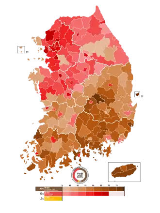 Jeonnam | 765,712 | (57.2%) | 480,800 | (35.9%) | 51,714 | (3.9%) | 17,312 | (1.3%) | 22,604 | (1.7%) | 1,338,142 | ![]() |