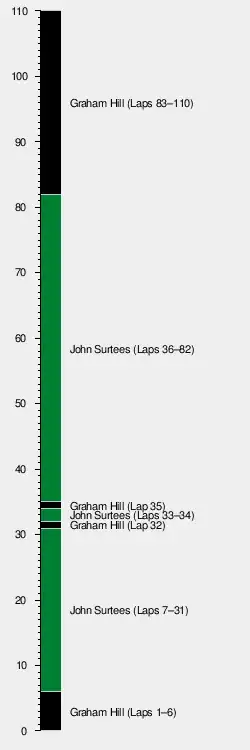 After trailing Surtees closely for some time, Hill lost his tow when his anti-roll bar came loose and the BRM's handling changed abruptly. Fighting severe understeer, he began throwing the car into turns to slide the rear end around, flinging stones off the curbs and losing ground to the leading Ferrari. On lap 82, with no threat to his lead, Surtees's engine lost power, and he cruised into the pits to retire. "I was just hanging on to him," Hill said afterward. "He's a very tricky driver. He was gaining a half-second each lap on me until he went out. I think it was a good measure of the difference in our two cars." Suddenly in the lead again, with only Ginther on the same lap, Hill backed off and set his sights on bringing the car home.