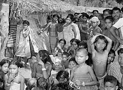 More than 75,000 refugees, of which about 35,000 were Christians, from East Pakistan arrived into Assam within one and half months since the genocide began. The refugees, mostly Garos, Hajongs and Dalus from Mymensingh took refuge in Garo Hills in Assam, now in Meghalaya.[44] The Observer reported that 12 provisional camps have been set up at Tura in the Garo Hills for the 50,000 refugees.[44] Lakshmi Menon, the Deputy Foreign Minister of India stated at the Lok Sabha that a column of 1,000 refugees from Mymensingh had been fired at by the East Pakistan Rifles, while they were crossing over to India.[45] By 28 March, around 78,000 tribal refugees had migrated from Mymensingh District in East Pakistan to present day Meghalaya in India.[42]
