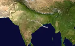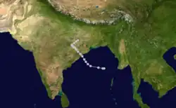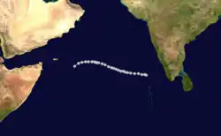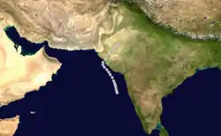 Under the influence of the ongoing onset of the southwest monsoon, a trough of low pressure developed over the Arabian Sea off the coast of Karnataka on June 6. It slowly moved northwards, and consolidated into a depression by the morning of June 9. The next morning, while the storm was moving northwestwards, the India Meteorological Department upgraded it to a Cyclonic Storm. Over the following days the storm intensified further into a very severe cyclonic storm, recurved northeastwards and crossed the coast of Gujarat near Naliya at a peak intensity of 969 hPa (28.61 inHg). The system rapidly degenerated inland and dissipated into a low-pressure area on June 13. 27 deaths were reported due to the cyclone in India.[4] Prolonged rains associated with the system triggered severe flooding in Pakistan that killed 450 people. Approximately 400,000 were affected by the floods and damage amounted to $4.1 million.[5]