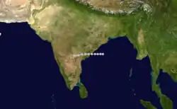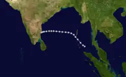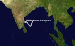 On December 15, an area of low pressure was identified over the southern Andaman Sea. Remaining nearly stationary,[22] it gradually developed into a depression two days later.[23] Despite being at a low latitude of 5°N, favorable conditions allowed the system to steadily strengthen, attaining hurricane-force winds by December 19.[22] Spanning approximately 965 km (600 mi), the cyclone reached its peak intensity on December 21 as it approached Ceylon.[23] Based on satellite imagery, it was estimated that the storm had peak winds of 240 km/h (150 mph), with gusts as high as 280 km/h (175 mph).[23] This ranked the system as a modern-day super cyclonic storm.[24] Weakening somewhat, the system continued westward, moving over Tamil Nadu, before rapidly weakening. The system degenerated into a remnant low after emerging over the Arabian Sea on December 24 and dissipated two days later.[22]