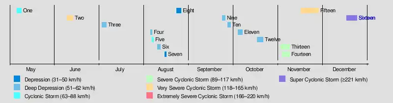 Severe Cyclonic Storm Fifteen developed in the Bay of Bengal on November 16. It meandered there for several days and peaked with winds of 130 km/h (80 mph). Eventually, it weakened and dissipated on November 28.[20] It was tied for the longest-lived cyclone on record in the basin.[21]
