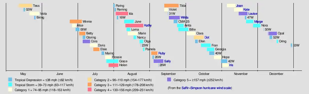 The 1964 typhoon season was the most active Pacific typhoon season on record.[1][2] All months between and including May and November were featured an above-average number of typhoons relative to the 1959–1976 period.[3] The China Meteorological Administration (CMA), Hong Kong Observatory (HKO), Japan Meteorological Agency (JMA), and Joint Typhoon Warning Center (JTWC) each maintain tropical cyclone databases that include their respective intensity and path analyses for 1964, resulting in disparate storm counts and intensities.[4] Total tropical cyclone counts for the 1964 season include 40 from the CMA, 34 from the JMA, and 52 from the JTWC (including 7 considered "suspect cyclones").[4][5][6]: 47 There were more named storms in the northwestern Pacific in 1964 than in any other year or in any other basin.[7]