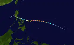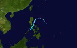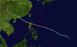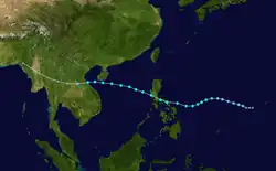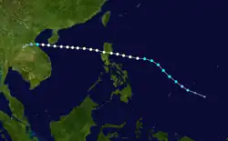 Typhoon Winnie—named Dading in the Philippines[45][15]—originated from a mid-Pacific trough, which organized into a cyclonic circulation on June 21 west-southwest of Pohnpei.[6]: 86 This initial system moved towards the west-northwest, passing near Ulithi on June 25. The next day, the disturbance developed into a tropical depression and gradually took on a more westward course. Winnie reached tropical storm strength on June 27 and then typhoon strength on June 28 as it rapidly intensified en route to southern Luzon.[44][12]: 74 The typhoon attained sustained winds of 165 km/h (103 mph) shortly before moving ashore Calabarzon on June 29;[44] its eye passed directly over Manila.[46] Winnie weakened as it moved over Luzon and restrengthened upon reaching the South China Sea, taking a west-northwesterly heading.[44][12]: 74 There, Winnie reached its peak intensity with winds of 185 km/h (115 mph) and a central pressure of 945 hPa (mbar; 27.91 inHg). At 00:00 UTC on July 2, the typhoon made landfall on Hainan southwest of Wenchang with winds of 175 km/h (109 mph). Winnie weakened to a tropical storm and traversed Hainan and the Gulf of Tonkin before making a final landfall near Haiphong, Vietnam, on July 3. Further weakening ensued as the system tracked across northern Vietnam and southwest China before dissipating on July 4.[44]