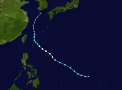 After passing the Ryukyu Islands and entering the East China Sea, Betty continued to intensify further, with its sustained winds reaching 205 km/h (127 mph) on July 5.[63] At the time, the typhoon was located approximately 320 km (200 mi) south of Shanghai.[12]: 75 Betty's winds subsequently began to diminish precipitously while the storm curved towards the north and then north-northeast, briefly paralleling the coast of Zhejiang before entering the Yellow Sea.[63][12]: 75 Betty degenerated into a tropical storm and further into a tropical depression on July 6. It then transitioned into an extratropical cyclone on July 7 and dissipated over open waters just off the coast of northwestern South Korea.[63][6]: 96