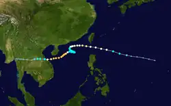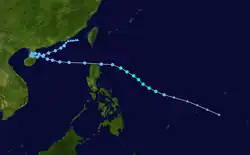 According to data from the Japan Meteorological Agency (JMA), the progenitor to Typhoon Viola emerged in the South China Sea just east of Vietnam on May 21.[34] This system initially moved towards the north before curving sharply east. Three days later, the system organized into a tropical depression after the JTWC identified a surface wind circulation.[6]: 81 Viola reached tropical storm strength on May 25 and then curved northwest, strengthening further into a typhoon on May 27 and peaking in strength with winds of 130 km/h (81 mph).[34] These winds diminished to 110 km/h (68 mph)—just under typhoon intensity—as Viola made landfall approximately 160 km (99 mi) west of Hong Kong at 03:00 UTC on May 28.[34][12]: 74 The storm weakened over mainland China and dissipated on May 30.[34]