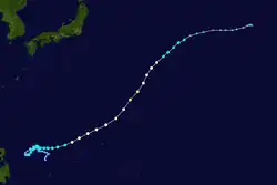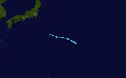 Tess tracked towards the northeast after reaching typhoon intensity. Its center passed between Alamagan and Guguan on May 20 while maximum sustained winds in the typhoon were 140 km/h (87 mph).[29] Farther southeast, in Guam, the passing storm produced 52 mm (2.0 in) of rain.[30] The next day, Tess reached its peak intensity with winds of 155 km/h (96 mph) and a minimum barometric pressure of 960 hPa (mbar; 28.35 inHg).[29] A seabee stationed on the island was presumed to have drowned after being swept away by the rough seas generated by the storm; two landing crafts were also destroyed by the rough seas.[31] At noon on May 21, the center of Tess passed 160 km (99 mi) west of Marcus Island,[12]: 74 bringing squalls accompanied by heavy rain and winds of 90 km/h (56 mph).[32][33] Gusts reached 117 km/h (73 mph) and rainfall accumulations reached 94 mm (3.7 in) on the island, though there was "little damage."[17] Gradual weakening followed,[12]: 74 with winds diminishing below typhoon intensity on May 22. The system then began to curve east as it transitioned into an extratropical cyclone by May 24, and was last noted three days later.[29]