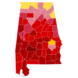 Goldwater received 77% of the white vote.[1] As of the 2024 presidential election, this is the last time that Sumter County, Greene County, Wilcox County, Lowndes County and Bullock County voted for a Republican candidate, as well as the last time that Macon County did not vote for the national Democratic candidate.[2] Alabama was one of five states that swung more Republican in 1964, alongside Louisiana, Mississippi, Georgia, and South Carolina.