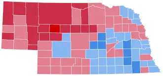 As of 2024, this is the last time the Democratic candidate won Nebraska at large or its 1st congressional district, as well as any of Adams County, Sarpy County, Cass County, Washington County, Saunders County, Gage County, Dixon County, Nemaha County, Richardson County, Boone County, Lincoln County, Polk County, Fillmore County, Johnson County, Cedar County, Buffalo County, Seward County, Hall County, Jefferson County, Thayer County, Webster County, Platte County, Nuckolls County, Clay County, Colfax County, Franklin County, Howard County, Nance County, Logan County, and Kearney County. Douglas County and Lancaster County would not vote Democratic again until 2008.[4] Barack Obama would later win the state's 2nd congressional district in 2008 and received one electoral vote from the state. Joe Biden, Obama's running mate in 2008, did the same in 2020, as did Kamala Harris, Biden's running mate in 2020, in 2024. Nebraska as a whole, however, has remained a safely Republican state, and has voted Republican by double-digits in every subsequent election.