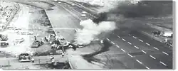 Fireball Roberts was involved in a crash while trying to avoid Junior Johnson and Ned Jarrett's crash on lap 7.[2][3][6] Roberts was sent to Charlotte hospital.[6] While he was not seriously injured by the crash itself, Roberts was trapped and engulfed in a blazing inferno as his fuel tank exploded, while his ankle became pinned under the dashboard and caught by either the clutch or brake pedal.[6] The death would have occurred at the speedway if Jarrett hadn't pulled Roberts out of the fire.[6] He died on July 2 of that year; leaving behind a wife (Doris Roberts) and a young daughter (Pamela Jane Roberts Trivette).[6] Jarrett would go up to Roberts, and Roberts, who was uninjured and conscious, told Jarrett "Oh my God, Ned, help me! I'm on fire!" after being immersed in flames, as a result of the crash.[7]