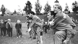![]() Manchester United players during their preseason tour in Finland, 21 September 1965. In front Paddy Crerand carries Denis Law; middle George Best carries Tony Dunne; at back Noel Cantwell carries Pat Dunne. | ||||
