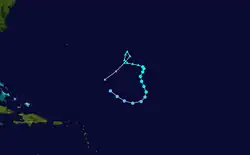 A cold front exited the east coast of the United States on November 22, and moved eastward. An extratropical storm developed along the front on November 26, located northeast of the Lesser Antilles. The storm moved northeastward, executed a small loop, and strengthened slightly. Gradually, the storm's structure became more symmetrical, and by November 29, the system transitioned into a tropical storm. At that time, the storm had peak winds of 50 mph (80 km/h), and was moving southward. On December 1, the storm weakened into a tropical depression, and on the same day, the track shifted to the west. On December 2, the depression dissipated.[4]