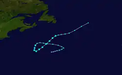 A cold front moved eastward from North America into the western Atlantic Ocean on August 28. An extratropical low developed on August 31 over the north Atlantic, which degenerated into a trough three days later. On September 4, another extratropical storm developed, located about 800 mi (1,285 km) south of Newfoundland. The system attained gale-force winds a day later, and turned westward on September 6, steered by a building ridge to the north. On September 7, the storm transitioned into a tropical storm, after its wind field became more symmetrical. Later that day, the storm attain winds of 60 mph (95 km/h), recorded by nearby ships. The storm turned to the east and northeast, crossing over its former path. On September 10, the tropical storm again transitioned into an extratropical storm, which later passed southeast of Newfoundland. The storm moved across the northern Atlantic Ocean, dissipating on September 13 southwest of Ireland.[4]