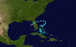 A trough persisted along the southeastern United States on October 15. A day later, a tropical depression formed along the trough near the northwestern Bahamas. The system quickly intensified into a tropical storm; due to its large circulation, the storm was potentially a subtropical cyclone. The storm moved in a counterclockwise direction – southeast at first, and eventually curving to the west-southwest. On October 18, the hurricane hunters flight reported maximum sustained winds of 65 mph (105 km/h). At 15:00 UTC that day, the storm made landfall at peak intensity near Flagler Beach, Florida. It quickly weakened while crossing the state, and dissipated the next day in the eastern Gulf of Mexico. The storm, in conjunction with a high-pressure system over New England, produced gale-force winds in the Carolinas.[4]