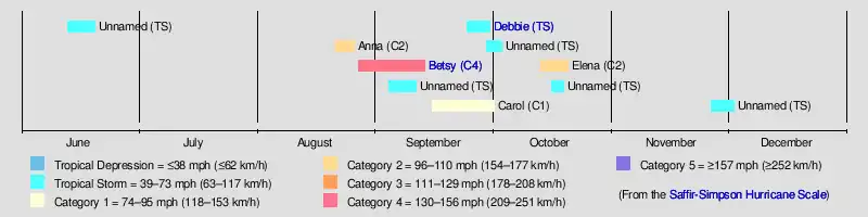 Season activity began with the formation of an unnamed tropical storm over the southern Gulf of Mexico on June 13.[4] There were no other tropical storms in the Atlantic basin until the latter part of August, when hurricanes Anna and Betsy formed. The latter developed on August 27 and eventually became the most intense tropical cyclone of the 1965 season, peaking as a Category 4 hurricane with maximum sustained winds of 140 mph (225 km/h) on September 2.[8]