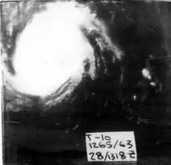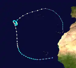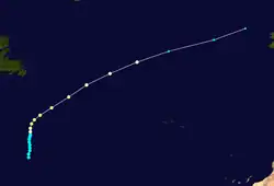 TIROS imagery indicated a very weak circulation near 12°N, 40°W on October 11. Ship reports on the following day indicated a somewhat more organized circulation.[7] As a result, it is estimated that the final tropical depression of the season at 1200 UTC on October 12, while located about midway between Cape Verde and the Leeward Islands. Initially, the depression remained disorganized while tracking northwestward. However, by early on October 14, the depression strengthened into Tropical Storm Elena. The storm continued to intensify as it headed northwestward, before turning to the northeast late on October 16. Elena became a Category 1 hurricane at 1200 UTC on October 17 and then reached Category 2 status early the next day. Around 1200 UTC, Elena attained its peak intensity with maximum sustained winds of 110 mph (175 km/h) and a minimum barometric pressure of 977 mbar (28.9 inHg). At 0600 UTC on October 19,[8] the storm merged with an approaching cold front near the Azores.[7] The remnants moved rapidly north-northeastward until dissipating near Iceland on October 20.[8]