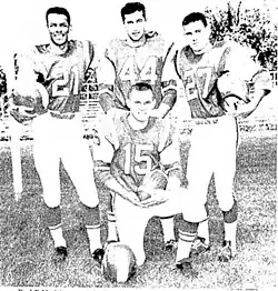 ![]() Offensive backfield. Quarterback Glen Ray kneeling. Standing from left to right: halfback Barry Roach, fullback Steve Kun; and halfback Leo Reimer. | |