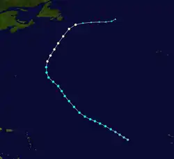 A tropical disturbance moved westward from the African coast on September 20. On September 26, satellite imagery and ship observations indicated that a tropical depression about 830 mi (1,340 km) east of Barbados.[2][4] At 21:00 UTC, the NHC issued their first advisory, naming the system Edith.[10] A nearby ship reported 16 ft (4.9 m) waves on September 27, potentially indicating stronger winds during periods without meteorological observations,[11] although unfavorable conditions prevented initial development.[12] It was not until 12:00 UTC that Edith attained tropical storm force winds. Twelve hours later, the storm reached peak winds of 60 mph (97 km/h),[6] a trend that spurred hurricane watches from Dominica northward through the Leeward Islands.[13] The storm failed to intensify due to its proximity to a cold upper-level trough and releasing too much latent heat. On September 30, Edith passed over Dominica as a weakened tropical storm and dissipated the next day over the eastern Caribbean Sea. It caused gusty winds and minor damage during its passage through the Lesser Antilles.[4]