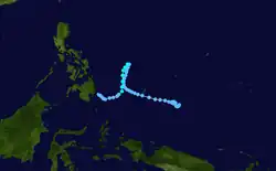 Therese emerged in the western Pacific on March 15 near the Caroline Islands as a tropical depression. Within 24 hours, it intensified into a tropical storm, moving steadily west-northwestward through the Philippine Sea. By March 18, Therese reached its peak intensity with sustained winds of 110 km/h (70 mph) and a central pressure of 990 hPa, classifying it as a "severe tropical storm" per the Japan Meteorological Agency (JMA).[2]