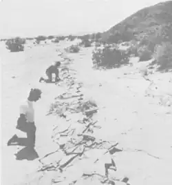 A 33 km (21 mi)-long surface rupture through Quaternary alluvium and lake bed sediments was revealed. At its northern extreme, the rupture sliced through the Palm Spring Formation. The rupture zone consisted of two northwest-oriented segments, separated by a 2 km (1.2 mi)-wide discontinuity.[13] Smaller, isolated ruptures were found 3 km (1.9 mi) away from the main trace.[14] A maximum horizontal offset of 38 cm (15 in) was measured along the northern rupture located 5 km (3.1 mi) northwest of Ocotillo Wells, at the foothills of Borrego Mountain.[15] Along the southern rupture, the maximum offset was 20 cm (7.9 in), measured 10 km (6.2 mi) southeast of Ocotillo Wells. Vertical offsets of up to 20 cm (7.9 in) were also recorded.[13]