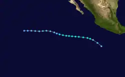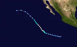 Forming from a disturbance in the ITCZ on September 9, the storm rapidly intensified, becoming a hurricane shortly after being upgraded into a tropical storm.[6] The hurricane eventually made a turn to the northeast, which took it to a landfall on Sinaloa near the town of Punta Piaxtla.[4] There were four Sinaloan casualties from the hurricane, and a worker in Texas was injured when the roof of a plant they were working at collapsed from accumulated rainfall due to the interaction between Naomi and a frontal system over the Gulf Coast.[14][15] The hurricane also was responsible for a panic involving the Lázaro Cardenás Dam, which was unfinished when the hurricane struck. Due in large part to the help of Automatic Picture Transmission technology, two towns downriver from the dam were saved when it was kept closed.[16] A total of $16 million (1968 USD) in damages was reported from the hurricane in Sinaloa.[14]