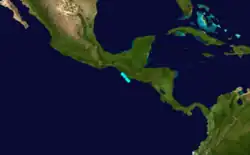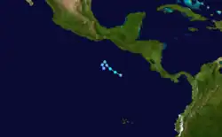 Kathleen developed from an ITCZ disturbance that was first noticed on August 23 while 400 mi (640 km) south of the Gulf of Tehuantepec. The disturbance moved to the west-northwest at 15 mph (24 km/h). A lack of surface information prevented Hurricane Hunter investigation into the system until August 25, when the disturbance developed into Tropical Storm Kathleen. Reports of heavy rains and winds of 35 mph (55 km/h) were reported by ships 75 mi (120 km) from the center of the storm at this time. Afterward, the storm moved westward, with verification of the intensity of the storm coming from the ship Denby Grange on August 28, which reported eastward winds of 45 mph (70 km/h) and a central pressure of 1,003 millibars (29.6 inHg) while north of the center.[4] The storm continued to move westward, weakening to a tropical depression on August 29.[6] The depression continued, moving into the Central Pacific late on September 1, ultimately dissipating on September 3.[3] Even though it was a long-lived storm, Tropical Storm Kathleen had little organization. Satellite pictures taken of the storm never showed more than a slight vortex.[4]