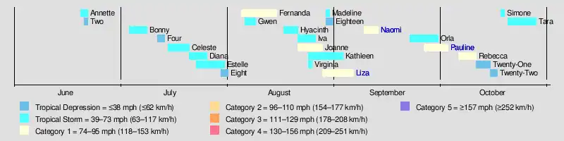 Several notable systems formed during the season. Five named storms—Hyacinth, Iva, Liza, Naomi, and Pauline—had effects in the United States. Two others—Annette and Tropical Depression Two—affected Mexico, and Tropical Storm Simone made a rare landfall on Guatemala. Tropical Storm Virginia, which formed in the West Pacific, crossed into the basin at a high latitude.