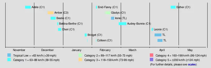 Gladys | 15–20 Feb | Category 2 tropical cyclone | 95 (60) | 987 | Western Australia | Unknown | Unknown | |