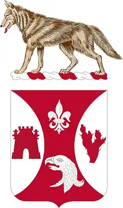 The cactus is derived from the coat of arms of the 125th Field Artillery, the 109th and the 110th Engineers; the fleur-de-lis, from that of the same organizations; the eagle's head, from the 110th Engineers; and the castle, from the 125th Field Artillery. This arrangement indicates descent from all organizations, using the colors of the Engineer Corps representing original approval of the design as an Engineer unit. The motto translates to "Now And Always."