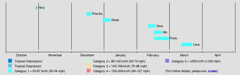 Priscilla | December 15 – 19 | Category 1 tropical cyclone | 75 km/h (45 mph) | 990 hPa (29.23 inHg) | Fiji | Minor | Unknown | [3] |