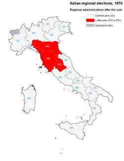 Twelve Regional Councils elected an administration led by Christian Democracy in a centrist alliance, while Emilia-Romagna, Umbria and Tuscany chose a leftist administration, the first two regions led by the PCI and the other one by the PSI.