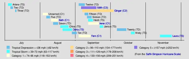 Activity was steady through most of the season. Hurricane Edith was its strongest system, reaching Category 5 on the Saffir–Simpson scale. It struck Nicaragua at peak intensity, killing dozens, and later hit southern Louisiana. Hurricane Ginger was its longest-lived system, lasting 27 days from early September to early October, setting a record for the longest known duration of a North Atlantic tropical cyclone (not surpassed until 2003). Ginger moved ashore in North Carolina, producing heavy rains and damaging winds. An unnamed storm in August attained hurricane status further north than any other Atlantic hurricane on record. On September 11–12, there were five active Atlantic tropical cyclones at one time.[3] Despite the activity, damage in the United States totaled about $235 million (1971 USD$, 1.82 billion 2025 USD), which National Hurricane Center forecaster Paul Hebert noted was "pretty small considering we had five storms in a row strike the U.S."[2] Most of the damage came from Tropical Storm Doria, which affected much of the East Coast of the United States. Hurricane Fern struck Texas after executing an unusual track, dropping heavy rainfall and producing flooding.