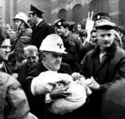 ![]() Leading Ambulanceman Bob Scott removes the body of the youngest victim, Colin Nicholl, from under the rubble | |