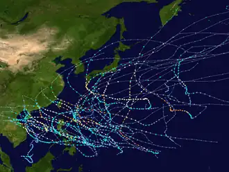Note: Data begins at the year 1955 due to earlier data being increasingly unreliable. Totals for tropical storms and typhoons after 1964 are from the Japan Meteorological Agency, and totals for the unofficial super typhoon category are from the Joint Typhoon Warning Center. |