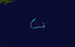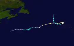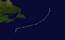 A very small, circular subtropical depression developed about 460 mi (740 km) northeast of Bermuda on September 19.[1] Initially, the storm moved north-northeastward and strengthened into Subtropical Storm Charlie early the following day. It then moved quickly northeastward and continued to strengthen. Later on September 20, Charlie peaked with maximum sustained winds of 65 mph (105 km/h). The system soon lost tropical characteristics and transitioned into an extratropical cyclone about 630 mi (1,010 km) east of Cape Race, Newfoundland, early on September 21. However, the extratropical storm deepened significantly, reaching a barometric pressure of 944 mbar (27.9 inHg), a reading typical of a strong Category 3 hurricane. Early on September 22, the extratropical cyclone dissipated over the far north Atlantic.[5]