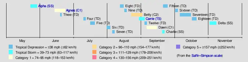 Tropical cyclogenesis first occurred in the month of May, with the development of Subtropical Storm Alpha. The month of June featured three tropical cyclones, including Hurricane Agnes and two tropical depressions. Three more systems formed in July, though all of them failed to reach tropical storm status. August was the most active month of the season, with five systems, including Hurricane Betty, Tropical Storm Carrie, and three tropical depressions. September featured slightly less cyclogenesis, with Hurricane Dawn, Subtropical Storm Charlie, and two tropical depressions. An additional three tropical depressions formed in October. Subtropical Storm Delta was the sole system in November, lasting from November 1 to November 7.[5]