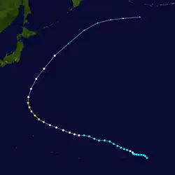 An area of enhanced convection in the ITCZ close to the equator formed into a tropical depression on November 11. It headed north northwest, and intensified into Tropical Storm Ruby on November 13. Ruby then abruptly turned west and crossed the dateline, briefly reaching hurricane status.[5][16] After becoming a typhoon just after crossing the dateline, the first time that had happened since 1967, Ruby steadily strengthened and eventually peaked as a moderately intense typhoon on November 16 while east of Taongi Atoll. It then steadily weakened as it headed west northwest, and wind shear destroyed the cyclone on November 20 when it was east of the Northern Marianas Islands. Ruby caused no deaths or damage. Of note is the fact that on November 17, Ruby had a central pressure of 983 mb (983 hPa), which is high for a 100-knot typhoon.[3]
